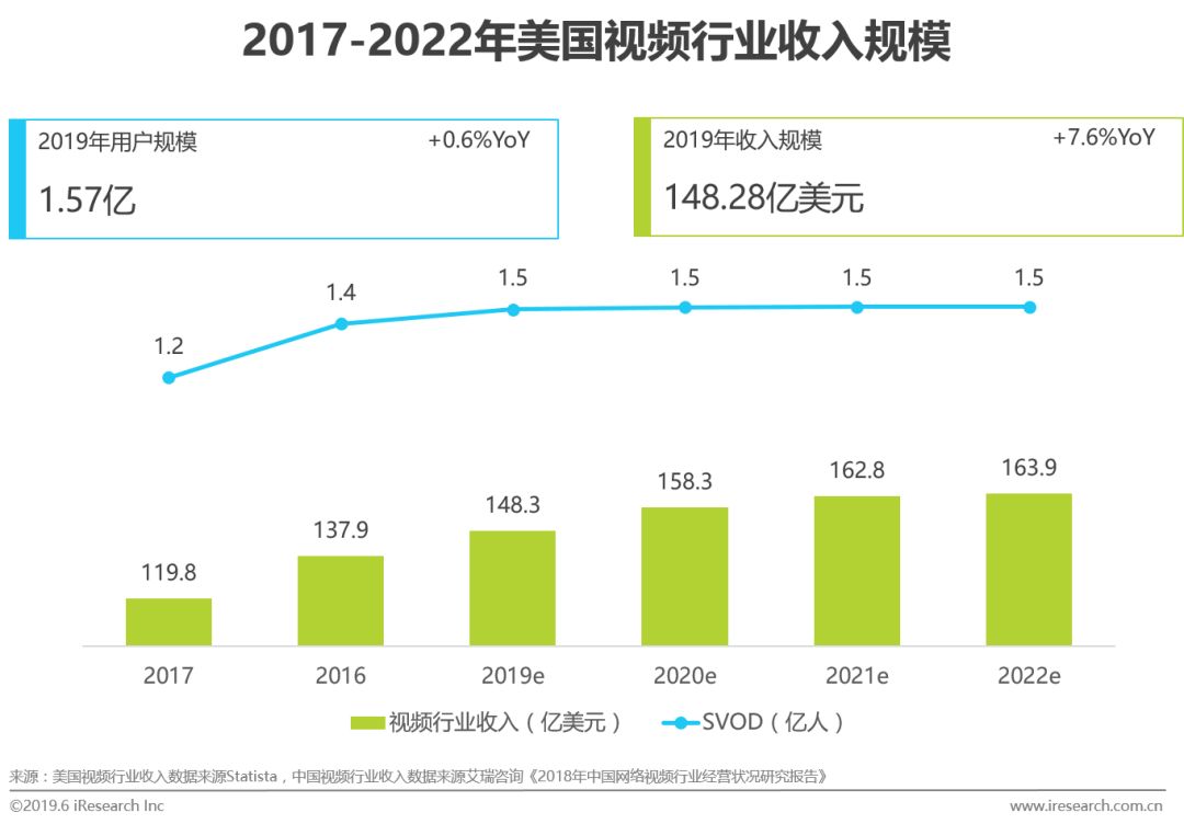 从美国视频行业的收入规模来看,2019年达148.28亿美元,YoY达7.6%,用户规模大1.57亿人,YoY为0.6%。根据艾瑞咨询的报告显示,2017年中国网络视频行业的收入规模达952.3亿人民币(合计148亿美元),网络视频的用户规模为5.8亿人。两国的视频行业主要收入模式为广告收入、SVoD和TVoD收入。