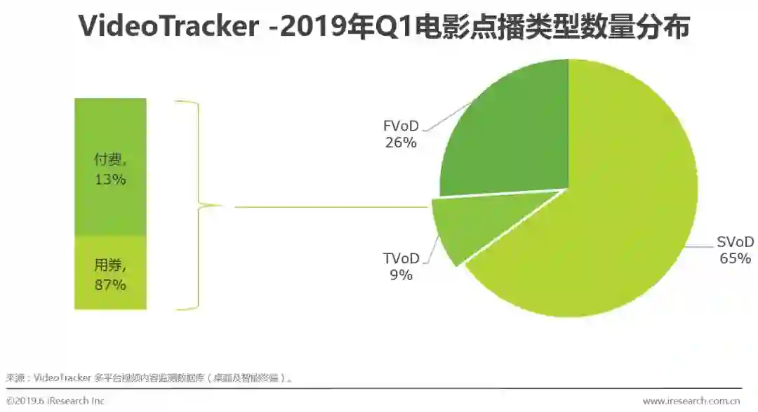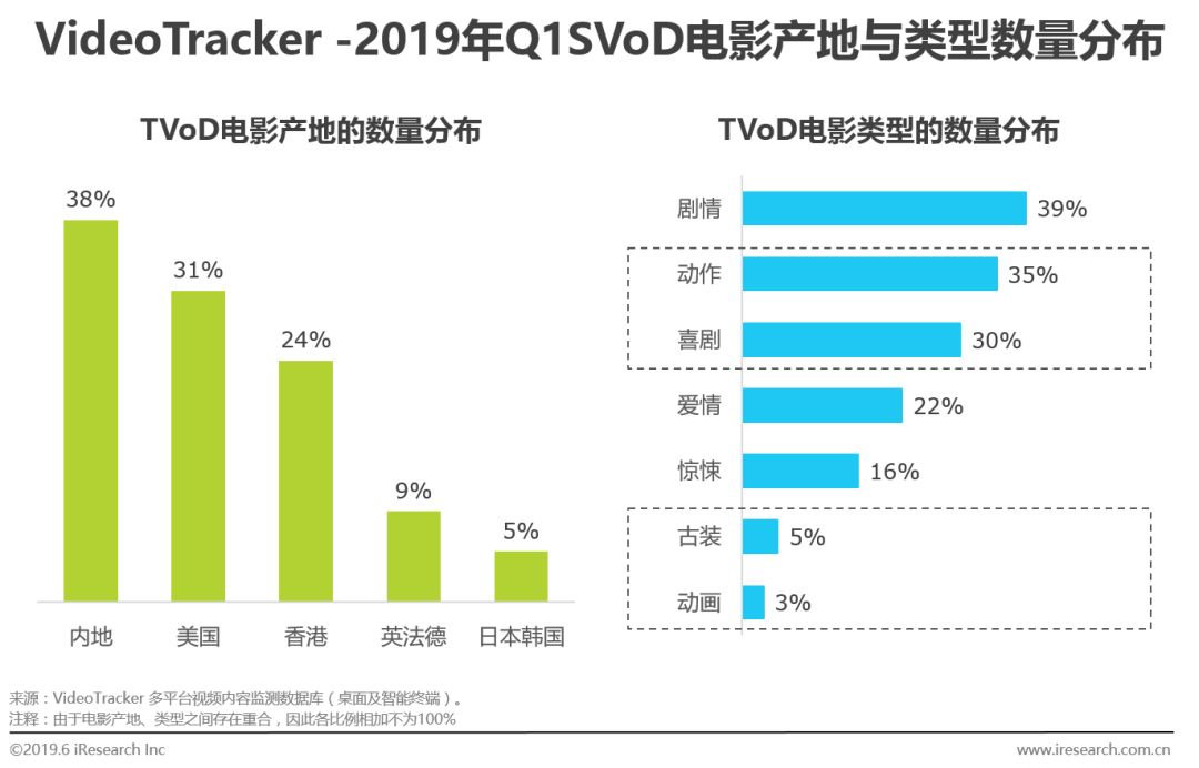 基于艾瑞VideoTracker 多平台视频内容监测数据库(智能终端)2019年Q1的数据显示,SVoD电影约为3900+部,占据近7成的比例; TVoD电影的数量不足一成(500+部),FVoD电影1500+部。SVoD电影的数量占比反映出我国目前头部视频网站中,用户观影的主要行为现状为“付费”观影。