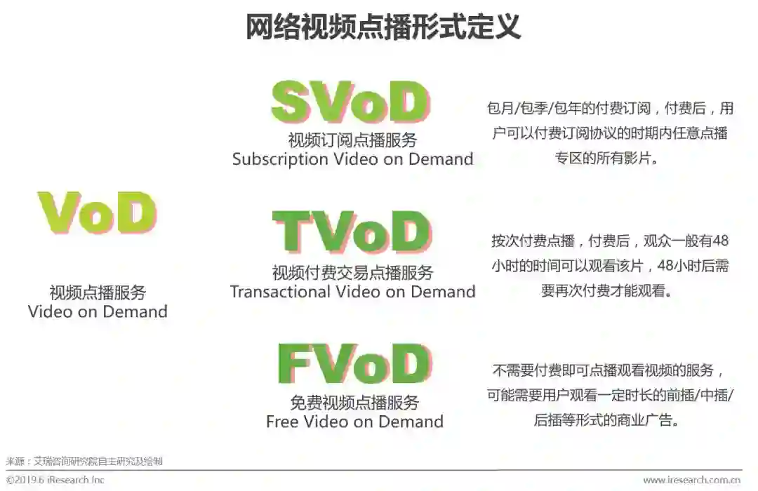 通过互联网电视、移动智能设备、PC网页或客户端,用户随时可以点播内容进行观看,统称为视频点播服务(后简写为VoD,Video on Demand)。通常点播的付费形式有三种,有只需要观看前插/中插/后插等形式的商业广告,便可以观看的免费内容 (后简写为FVoD, Free Video on Demand),但目前更多的是需要付费订阅的视频订阅点播服务(后简写为SVoD,Subscription Video on Demand)和视频付费交易点播服务(后简写为TVoD,Transactional Video on Demand),由此视频网站可以设计广告、会员服务、版权/自制内容等三大运营方式。其中在中国的视频平台上TVoD包括用券观看以及付费点播两种形式。平台推出差异化的视频内容组合,可扩大用户受众面,将自身的商业价值最大化。