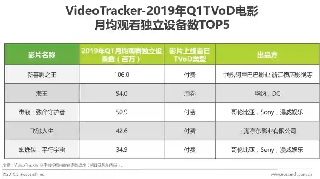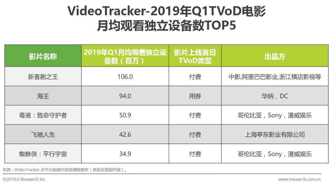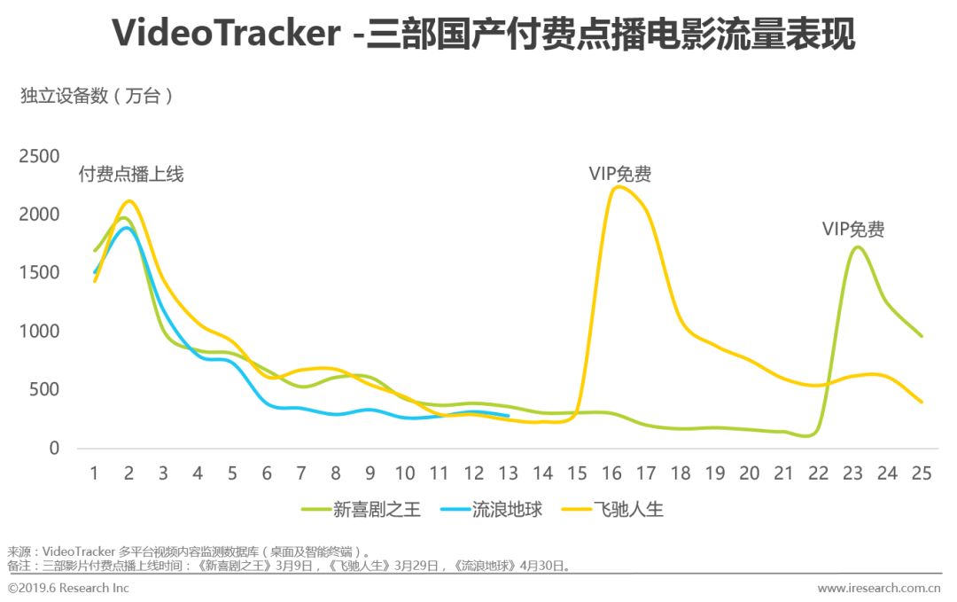 2019年春节档的三部影片《新喜剧之王》、《飞驰人生》、《流浪地球》均先后试水视频网站付费点播,虽然引发一定争议,但依然取得不俗流量表现。根据艾瑞VideoTracker 多平台视频内容监测数据库(智能终端)的数据显示,三部影片在付费点播上线次日观看的活跃设备数达到2000万台左右。定价上,三部国产影片均是非会员12元,会员6元,高于一般好莱坞影片定价(通常是非会员5-6元,会员2.5-3元)。