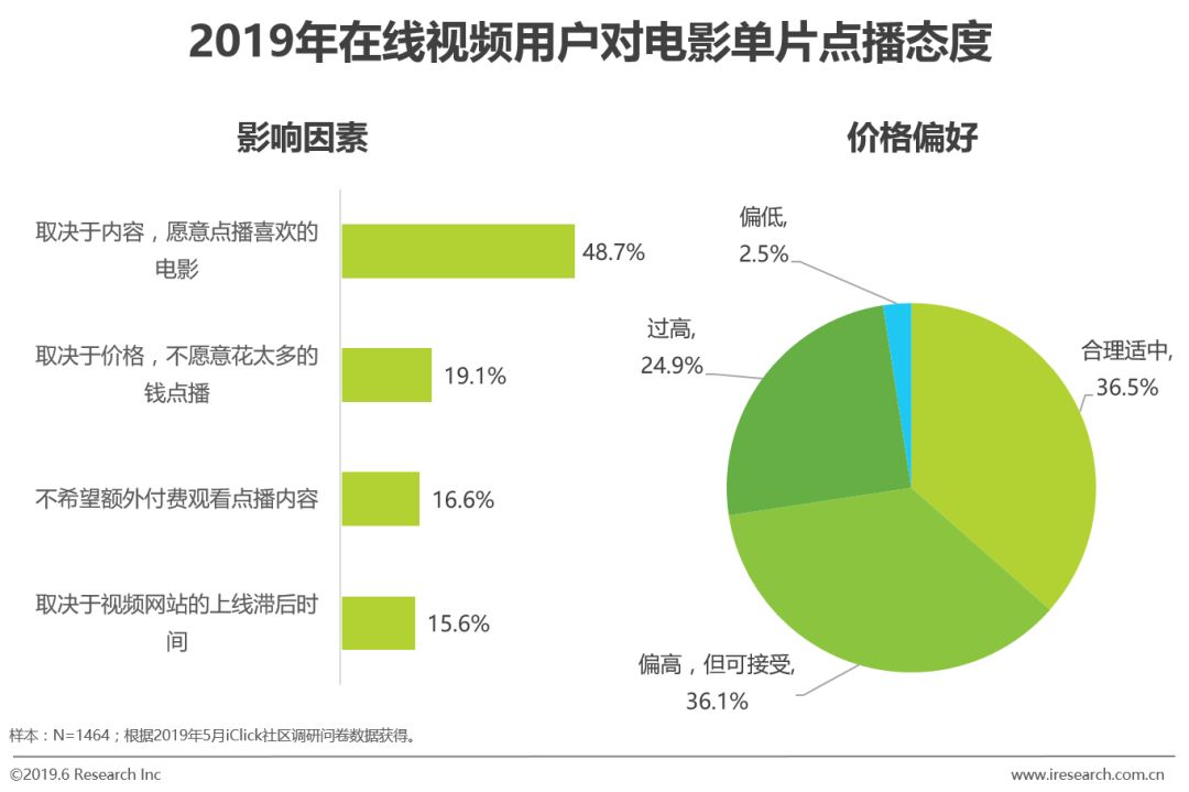 艾瑞线上调研数据显示,对于目前的电影单片点播价格(平均6元/部,最贵12元/部,会员半价),72.6%的用户表示可接受,仍有价格潜力。预计未来会根据不同影片出现定制化的付费点播定价,如产地(如好莱坞与国产)、出品方、影片类型(如剧情片、文艺片)、上线窗口期、影片的院线票房表现及获奖情况等,甚至不同平台的定价策略也或将出现分化。