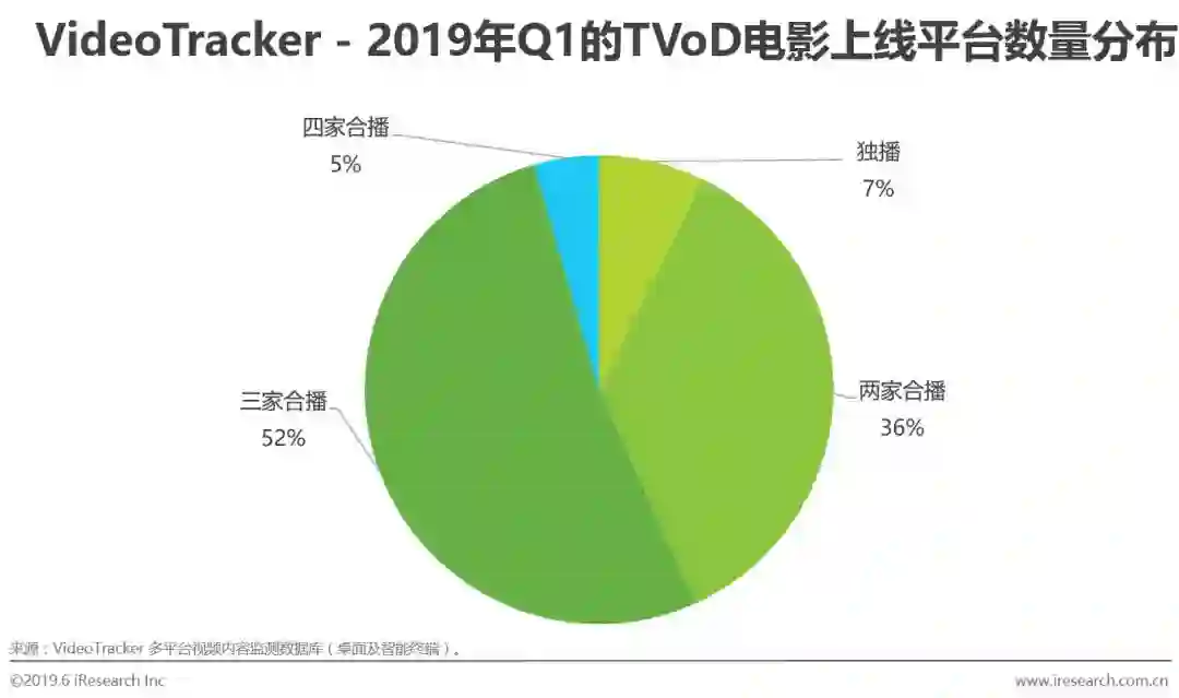 从爱奇艺、腾讯视频、优酷以及芒果TV播出的TVoD电影来看,三家视频平台合播的电影数量占比为52%,其次是两家合播(占36%),不足10%为独播。由此可见, 目前大部分的片方在点播电影的策略上还是选择多平台合作的方式为主,需要依靠更多的用户点击量来保证电影线上点播付费的收益情况,从而将线上版权的分账收益最大化。