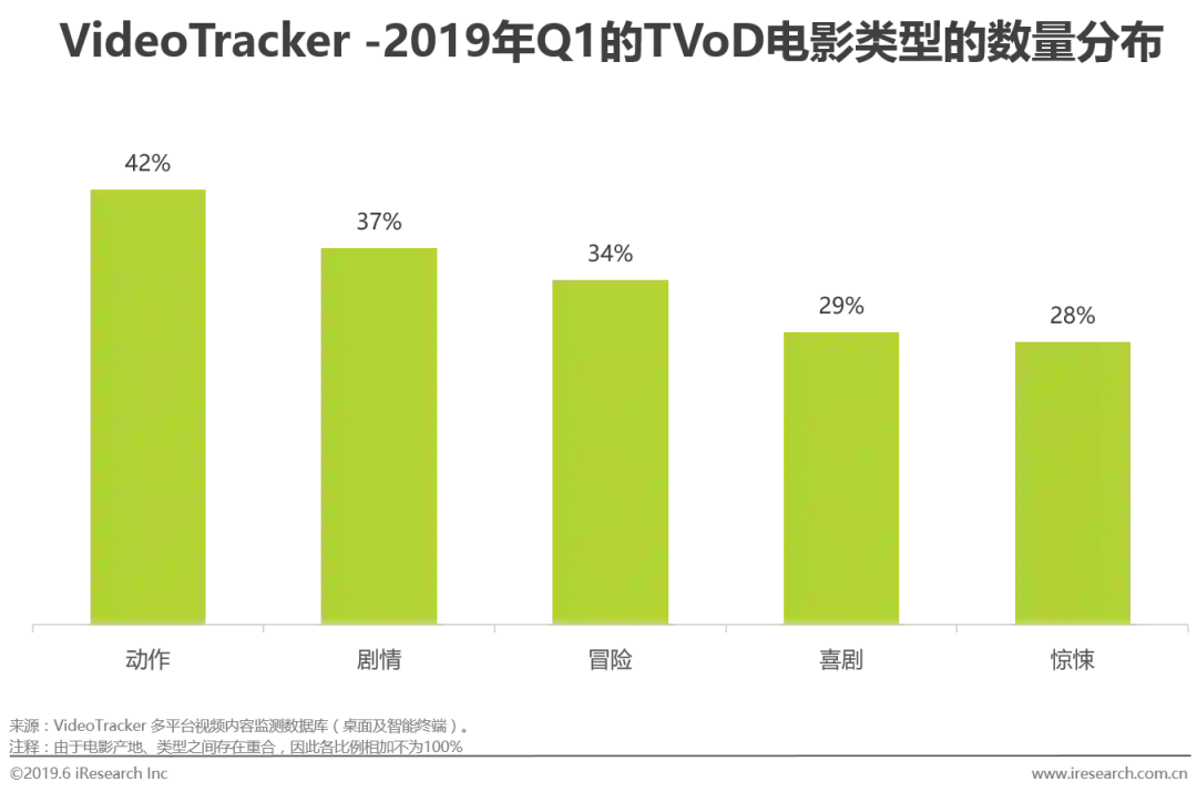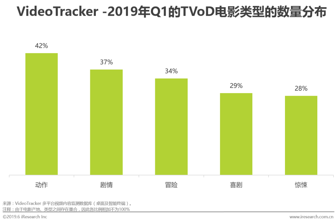 由于视频平台在现阶段的会员运营策略中,一个月会免费赠送多张点播观影券,用户不需要付费点播即可观看到最新上映的大片。因此,2019年Q1的TVoD电影中,八成以上仅需用券即可观看。从电影数量占比上看,动作、冒险、喜剧类型的TVoD电影最受欢迎。其中,在SVoD电影中表现平淡的冒险、惊悚类电影,在TVoD电影中反而更受欢迎,比如《神奇动物:格林德沃之罪》、《侏罗纪世界2:失落王国》等。