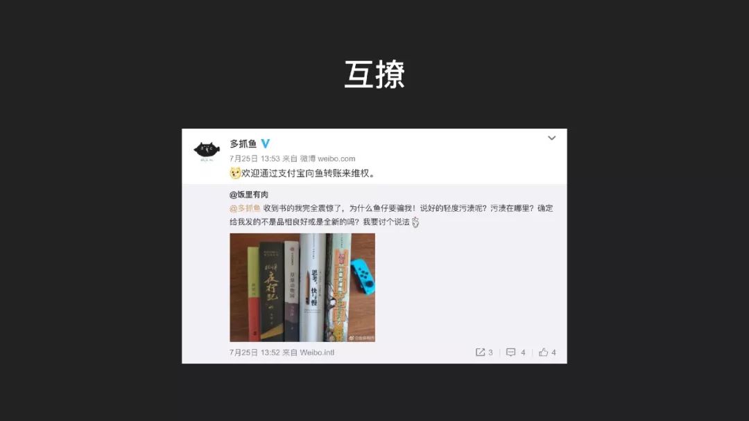互撩。有些用户也是很幽默的,你跟他开玩笑,他也会找你开玩笑,每天可能会看到很多段子。我们会用即刻订阅微博上所有提到关键字多抓鱼的内容,天天会看用户在微博上怎么说我们。