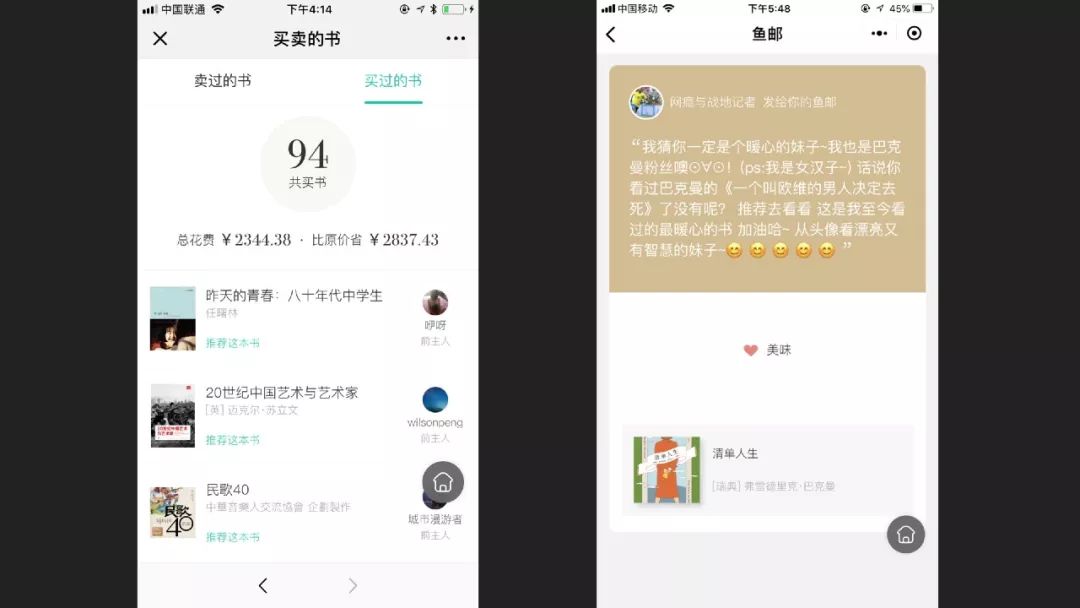 这张图是我们最早做的一个叫鱼邮的彩蛋功能,就是当你的书售出的时候,我们会给你发一个模板通知,跟你说谁买了你这本书,你可以在线上给他留个言。买家收到货的同时也能收到一条来自卖家的话是比较惊喜的。我们为什么要花心思做这些看上去跟交易不相关的事情呢?因为我们觉得二手的供给是来自全社会的,而其中的好东西才更值得二手流通,这让平台有一个机会去推荐真正的好东西。而让用过的用户自己来推荐才是最可信的内容。于是,我们也做了一个叫书单的产品。每个书单对应运营做的一个主题,然后大家都可以选一本你觉得符合主题的书来推荐并写上推荐语。我们觉得把推荐好东西这件事情做好,是我们能提供一个很重要的价值,也能帮助我们把二手循环这个事情做得更好。