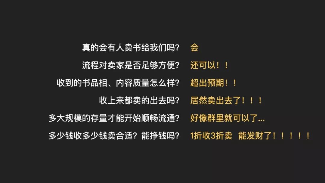 前期 MVP 到底是什么东西呢?我们的是做法是:一个微商群+ Excel表。我们那个时候团队大概有几个人,我们让每个人去把他在北京认识的人里面找最喜欢读书的人拉进群里来,群主就是我们的运营。我们制订了一个规则,如果你想卖书了就@一下群主,说你要卖书了,他就会找你来私聊,群主会说你把书撂在一起拍个照给我就行了,然后他会告诉用户,哪些书是要的,哪些书是不要的,再帮他叫快递上门取件。等我们收到书,检查无误就会通过微信把钱打给他。收到书我们会补充介绍售价等信息在 Excel 里,然后丢到群里面告诉大家上新了,可以来买书了。大概就是这样一个验证的模式。我们验证的结果是什么样的?它需要回答刚才列的那些问题。