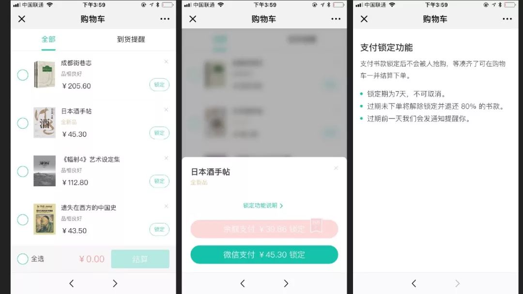 这个问题引发我们想一个问题,二手电商的购物车到底该怎么做?可能并不是你拿着新品电商一样的解决方案就能解决问题。开始我们想甚至把购物车都颠覆掉,后来觉得每个新东西都是有很大的认知成本的,于是我们做了一个小的改动,在购物车里面加了一个叫锁定的按钮。锁定按钮解决什么问题?比如到货提醒来了,发现这本书有货,你又不想马上下单,你可以先付钱把这本书锁定了,这本书就是你的了。
