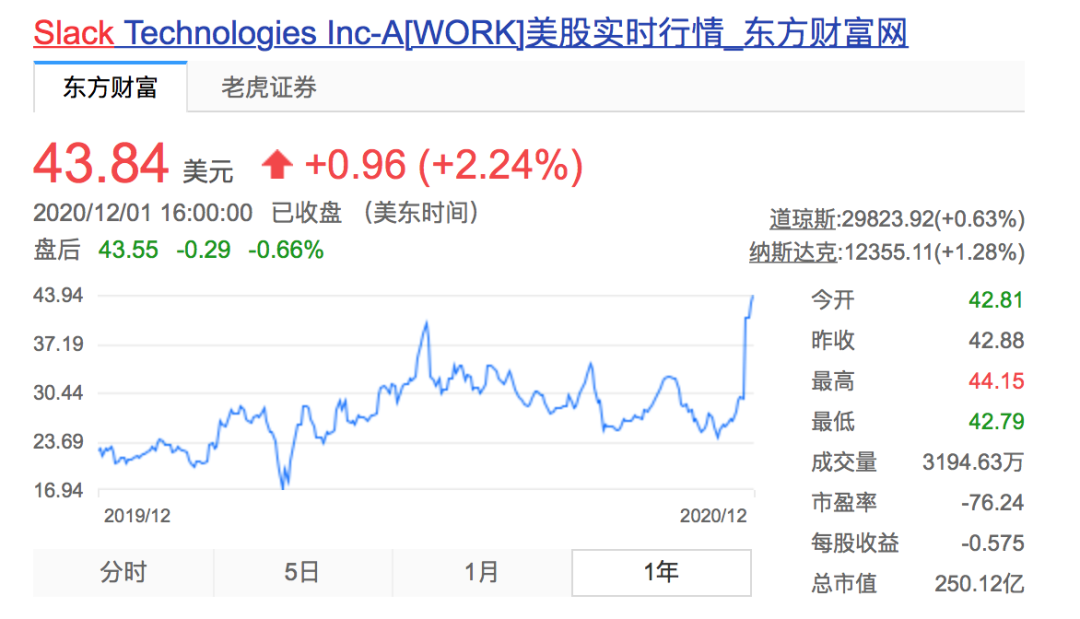 Slack于2019年6月在纽交所上市,该股当时开盘价为38.50美元。今年的疫情,让Slack的股价坐上过山车:3月交易价格跌至17美元,随后在6月回升至接近40美元,然后在11月中旬跌破25美元。