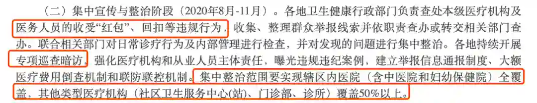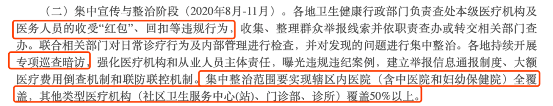 进入到8月份,就正式进入集中宣传与整治阶段。各地卫生健康行政部门负责查处本级医疗机构及医务人员的收受“红包”、回扣等违规行为,收集、整理群众举报线索并依职责查办或转交相关部门查办。(赛柏蓝器械)