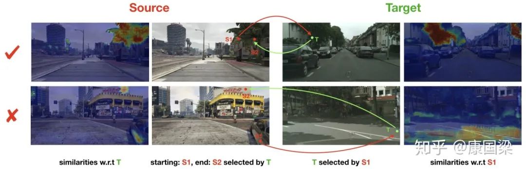 如上图所示,对于随机采样的 source 和 target 图片,我们首先建立他们像素级别的关联。我们利用像素级别的循环一致性 (pixel-level cycle consistency) 来建立这种关联。具体来说,对于任一 source 图片中的像素 S1,我们在 target 图片中选择与之相似度最高的像素 T。然后,对于选择的 target 像素 T,我们反过来选择与之最接近的 source 图片中的像素 S2。如果 S1 和 S2 属于同一个类别,我们则建立 S1--> T --> S2 的关联,否则,关联不成立。