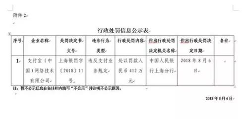 此外,中国人民银行上海分行行政处罚信息显示,支付宝(中国)网络技术有限公司因违法支付业务规定被处以罚款412万元。作出行政处罚的决定日期为8月6日。