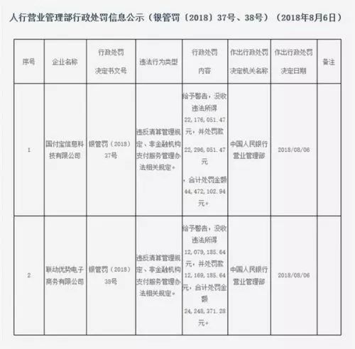 其中,国付宝信息科技有限公司违反清算管理规定、非金融机构支付服务管理办法相关规定,给予警告,没收违法所得22,176,051.47元,并处罚款22,296,051.47元,合计处罚金额44,472,102.94元。