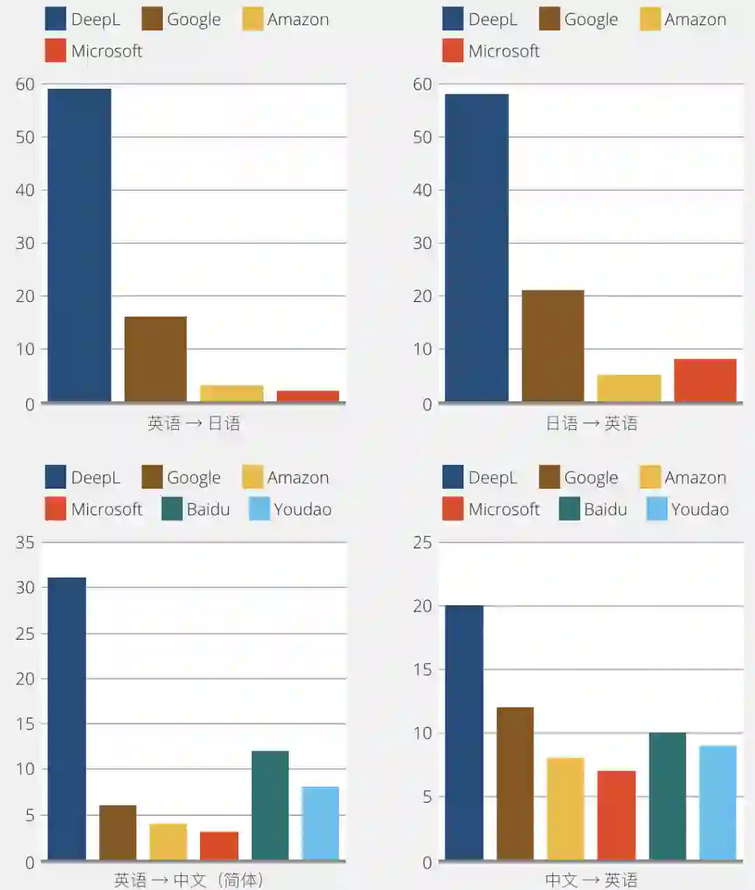 但是有多精确呢?作为一个严谨的科技软件,当然还是要用数据来说话,DeepL官方也公开了日英互译和中英互译的盲测结果,如下图所示,可以看出,DeepL简直就是碾压级的存在嘛: