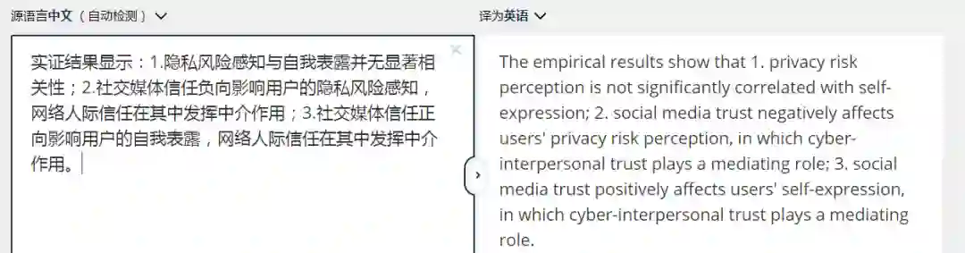 原文:实证结果显示:1.隐私风险感知与自我表露并无显著相关性;2.社交媒体信任负向影响用户的隐私风险感知,网络人际信任在其中发挥中介作用;3.社交媒体信任正向影响用户的自我表露,网络人际信任在其中发挥中介作用。
