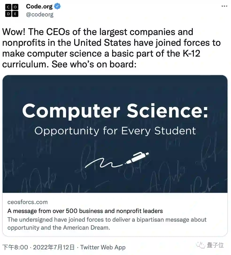 500多名商业、教育和非营利组织领导人与计算机教育非营利组织Code.org合作,呼吁州政府和教育领导人为全美K-12学生提供更多的计算机教育。