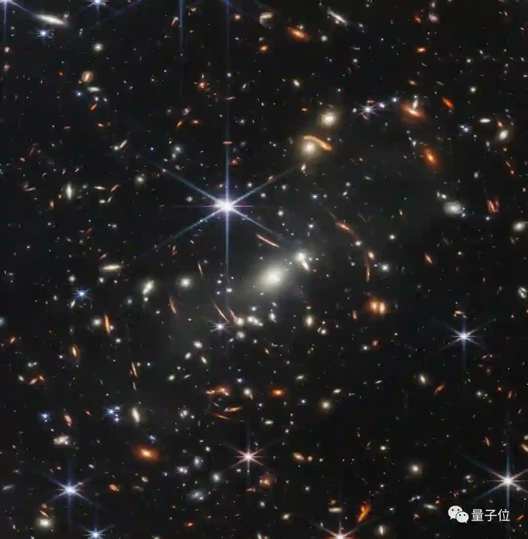 这个星系团SMACS 0723,距离地球46亿光年,其大小相当于将你指尖的一粒沙放在一臂远的地方,所能覆盖的天空。