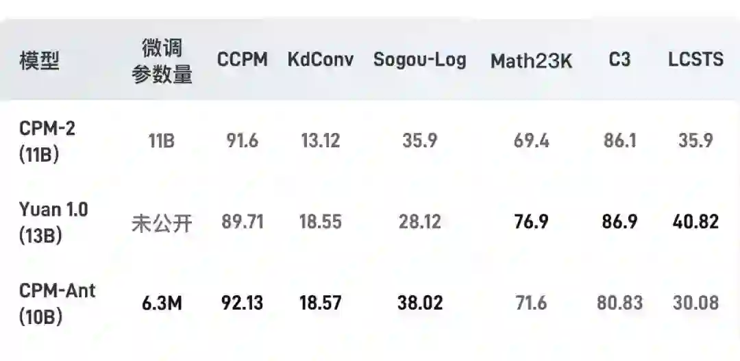 在 OpenDelta[3] 的帮助下,我们进行了所有的实验,而没有修改原始模型的代码。需要指出的是,在下游任务上评测 CPM-Ant 模型时,我们没有使用任何数据增强的方法。实验结果如下表所示: