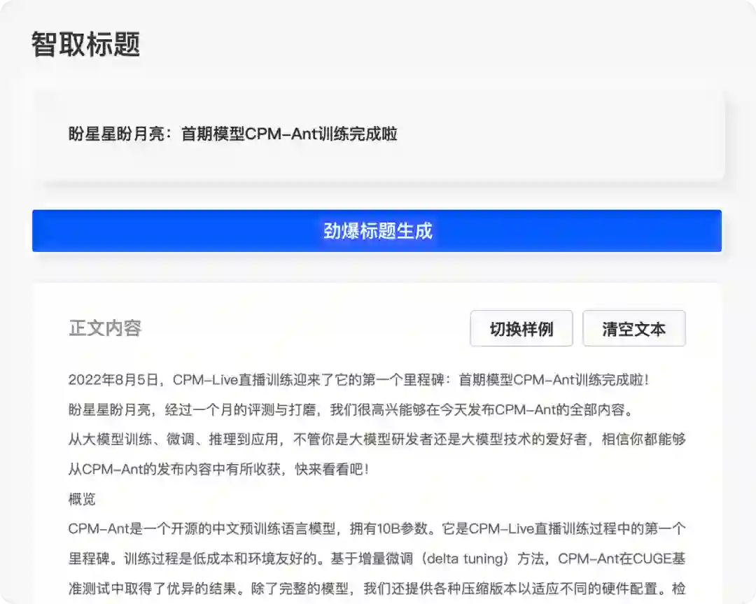 为了进一步验证模型的有效性并提供范例,我们在 CPM-Ant 基础上微调了一个劲爆标题生成器以展示模型能力。只需要把正文内容粘贴到下方文本框,一键点击生成,就可以得到大模型提供的劲爆标题!