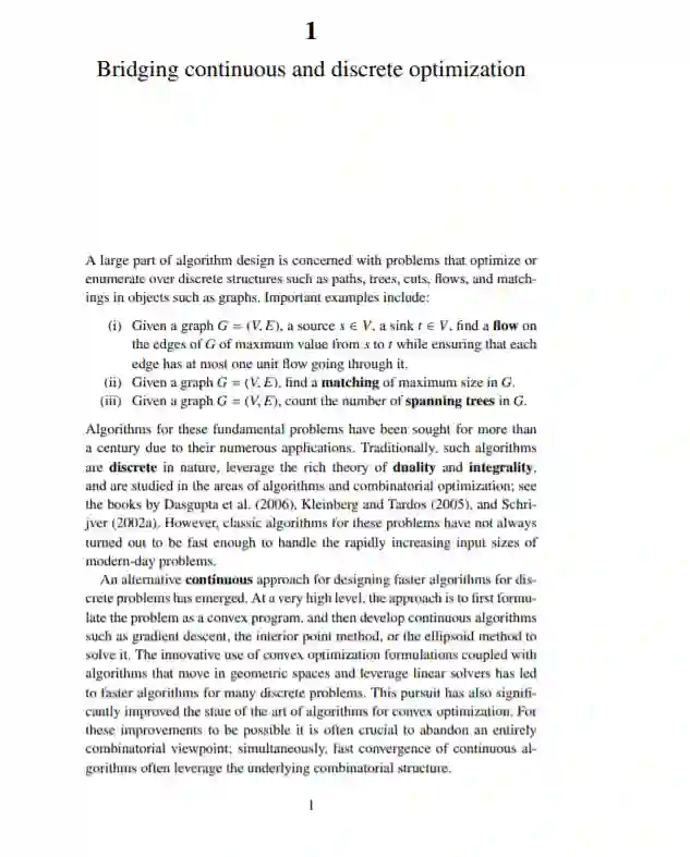 这本书的目的是使读者能够获得对凸优化算法的深入理解。重点是从第一性原理推导出凸优化的关键算法,并根据输入长度建立精确的运行时间界限。由于这些方法的广泛适用性,一本书不可能向所有人展示这些方法的应用。这本书展示了各种离散优化和计数问题的快速算法的应用。本书中所选的应用程序的目的是为了说明连续优化和离散优化之间的一个相当令人惊讶的桥梁。