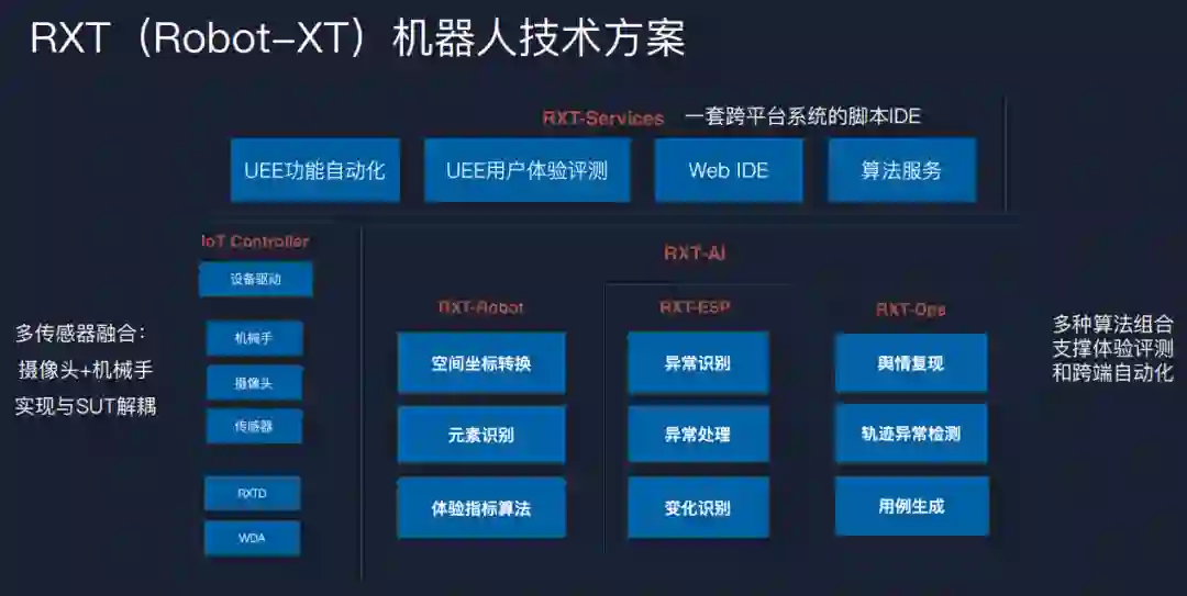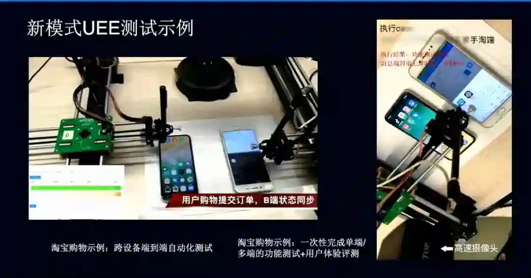 UEE 测试需要具备用户交互体验评测能力和多设备端到端功能自动化能力。一方面用户交互体验评测能力,即通过 IoT(如摄像头、机械⼿、传感器)等外部设备采集,并通过 AI 算法将真实⽤户感受数字化,来获取最接近真实⽤户体感的性能及⽤户体验指标;另一方面多设备端到端功能自动化能力,即通过机械⼿对多设备跨终端进行⾃动化测试,通过 AI 算法实现 IoT 设备的调度控制、对象识别、测试步骤执⾏、异常处理等。