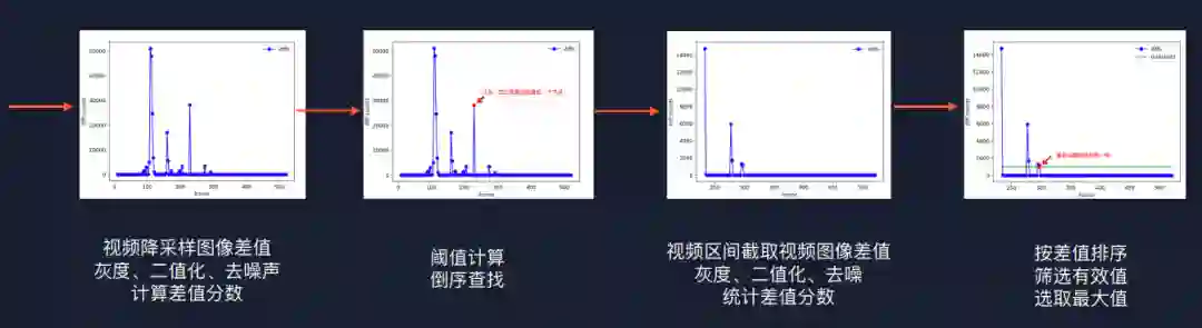 在体验评测自动化中,用户真实感受到的加载时长,等于从机械手点击到页面变化最后一帧的时间差,所以这里的关键在于,如何去判断页面加载的结束帧。我们采取视频降采样,根据灰度、二值化、去噪声计算图像的差值分数,即变化的程度,随后用实验测出合适的阀值,之后在整个视频区间,倒序查找阀值之上,最后一个差值,即为最后一帧,流程如下图所示: