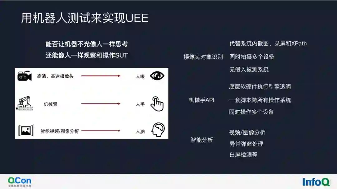 首先,可以使用高清、高速摄像头模拟人的眼睛,引入摄像头的对象识别机制,代替原有存在系统内截图、录屏和 XPath,做到无侵入被测系统;其次,用机械手模拟人的手指,包括一些伸缩、滑动动作,这里封装一套机械手的操控 API,并且它要实现底层软硬件执引擎透明,既可用机械,手也可用传统软件层执行;最后,通过算法代替人脑智能分析,实现视频 / 图像分析、异常弹窗处理、白屏检测等。