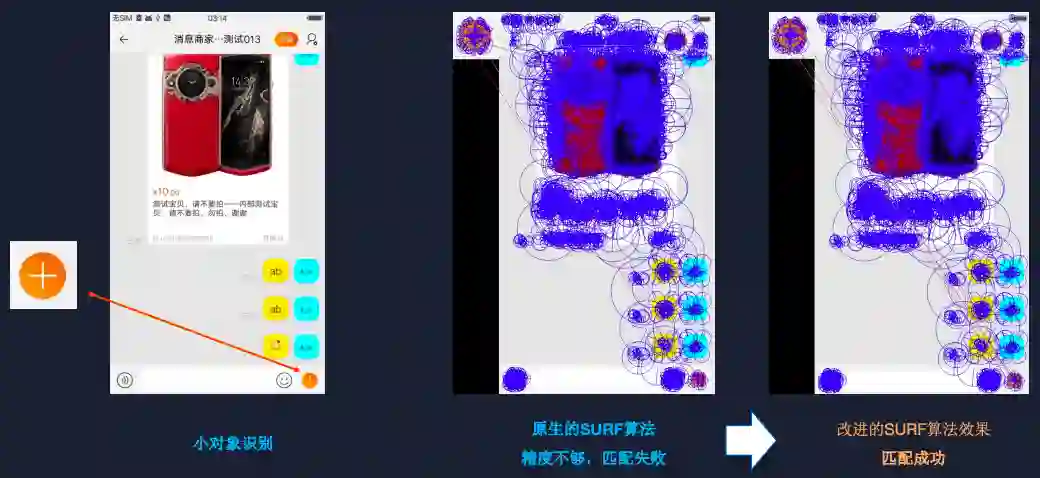 识别对象时,我们改进了 SURF 算法,叠加了 OCR 技术,增强了小图标识别能力。原生的 SURF 算法精度不够,对于特征相似的图像经常匹配失败。我们在特征向量上增加了斜率判断,匹配的成功率大幅度上升(如图中情况 3)。如特殊情况屏幕中存在多个相同小图标,则需要手动调参。