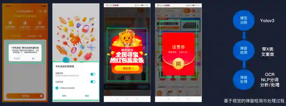 图一、图二中系统级的弹窗,可通过 OCR 识别先将文字提取出来,用 Bert 进行语义理解,识别出“好”“确定”等词后,进行点击;对于图三、图四中的业务级弹窗,我们首先通过 Yolov3 进行模型训练,将弹窗从背景中分割出来,分割后,可识别每个弹窗的圆×进行。该组合算法可处理手淘 95% 以上的弹窗。