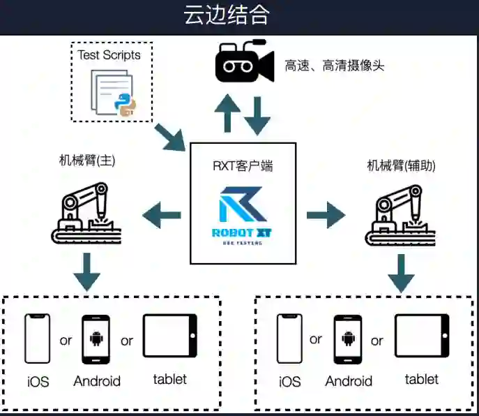 “为模拟真实用户”,Robot-XT 极测机器人提供了为用户体验度量评测的能力,不仅可以最大程度地模拟用户真实操作,还实现了多设备跨终端的功能自动化和用户体验度量。同时,Robot-XT 极测机器人,通过 IoT+AI 的智能化技术搭建了一套支持多机操作,并具备高稳定性的 UEE 自动化解决方案,实现了从线上 App 到线下智能门店场景的端到端自动化测试,
