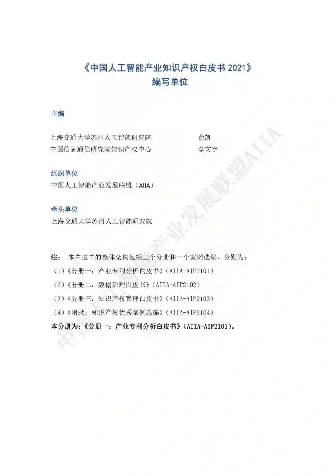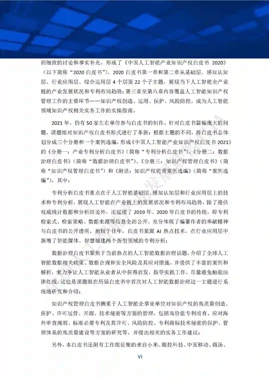 2021年,仍有50家左右单位参与白皮书的制作。针对白皮书篇幅庞大的问题,课题组对知识产权白皮书形式进行了革新:根据主题的不同,将白皮书总体划分成三个分册和一个案例选编,形成《中国人工智能产业知识产权白皮书2021》的《分册一:产业专利分析白皮书》(简称“专利分析白皮书”)、《分册二:数据治理白皮书》(简称“数据治理白皮书”)、《分册三:知识产权管理白皮书》(简称“知识产权管理白皮书”)和《附录:知识产权优秀案例选编》(简称“案例选编”),其中: