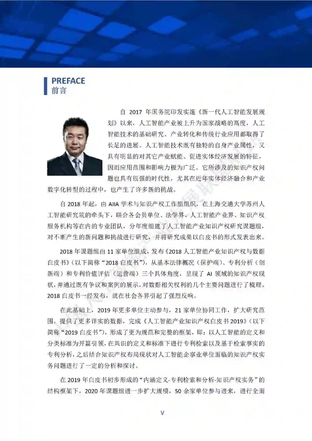 自2017年国务院印发实施《新一代人工智能发展规划》以来,人工智能产业被上升为国家战略的高度,人工智能技术的基础研究、产业转化和传统行业应用都取得了长足的进展。人工智能技术既有独特的自身产业属性,又具有明显的对其它产业赋能、促进实体经济发展的特征,因而应用范围和影响力极为广泛。它所涉及的知识产权问题也具有很强的时代性,尤其在近年实体经济融合和产业数字化转型的过程中,也产生了许多新的挑战。