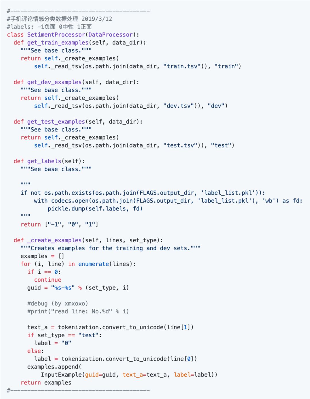 训练模型就直接使用BERT的分类方法,把原来的run_classifier.py 复制出来并修改为 run_mobile.py。关于训练的代码网上很多,就不展开说明了,主要有以下方法: