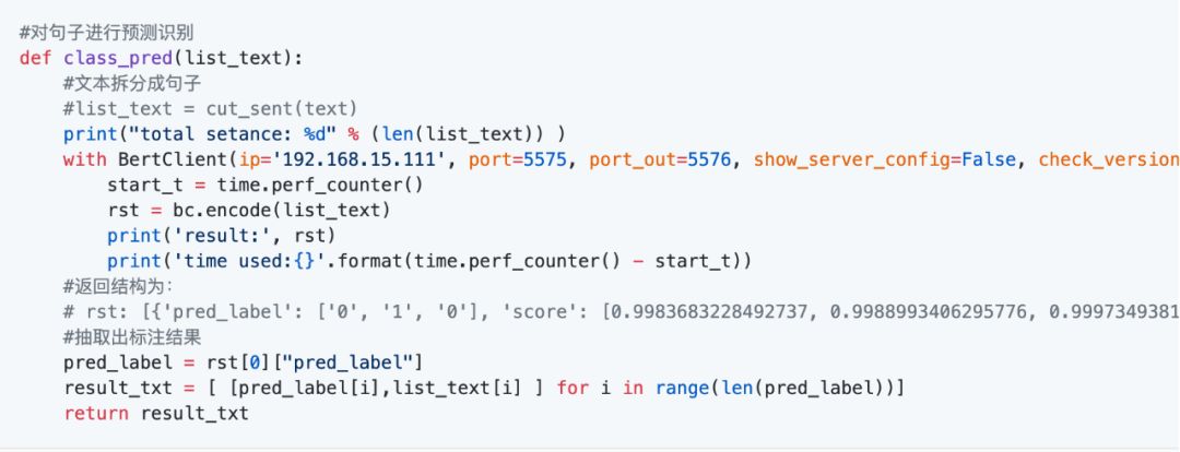 API服务端的核心方法,是与BERT-Serving进行通讯,需要创建一个客户端BertClient: