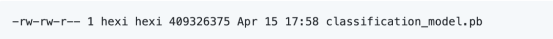 执行成功后可以看到在model_dir目录会生成一个classification_model.pb 文件。转为.pb格式的模型文件,同时也可以缩小模型文件的大小,可以看到转化后的模型文件大约是390M。