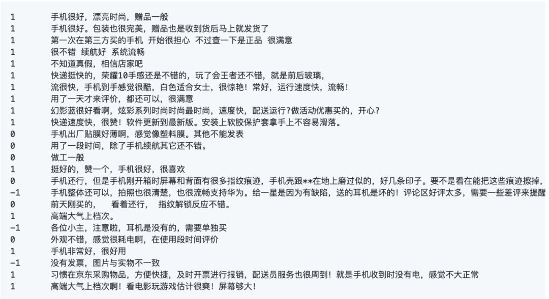 这里用的数据是手机的评论,数据比较简单,三个分类: -1,0,1 表示负面,中性与正面情感 数据格式如下: