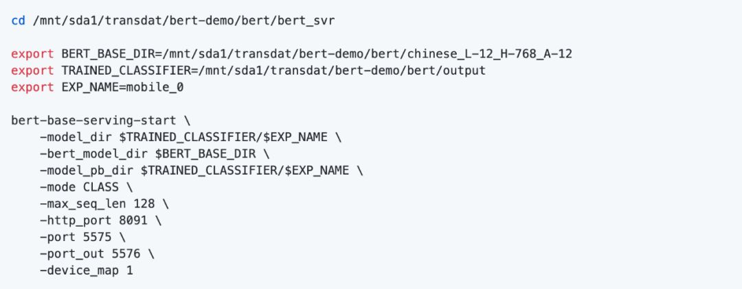 运行服务后会自动生成很多临时的目录和文件,为了方便管理与启动,可建立一个工作目录,并把启动命令写成一个shell脚本。这里创建的是mobile_svr\bertsvr.sh ,这样可以比较方便地设置服务器启动时自动启动服务,另外增加了每次启动时自动清除临时文件