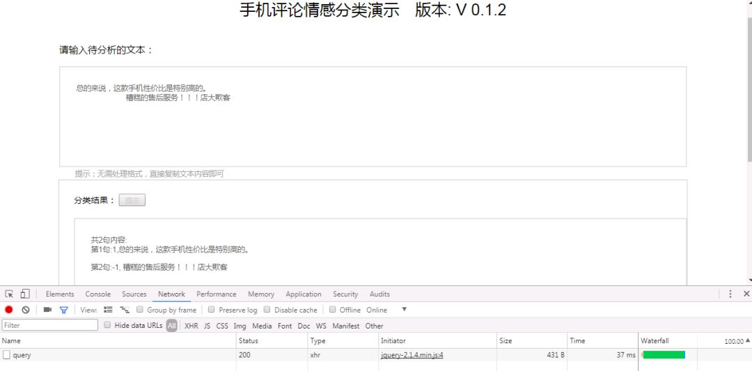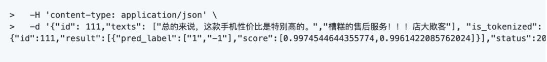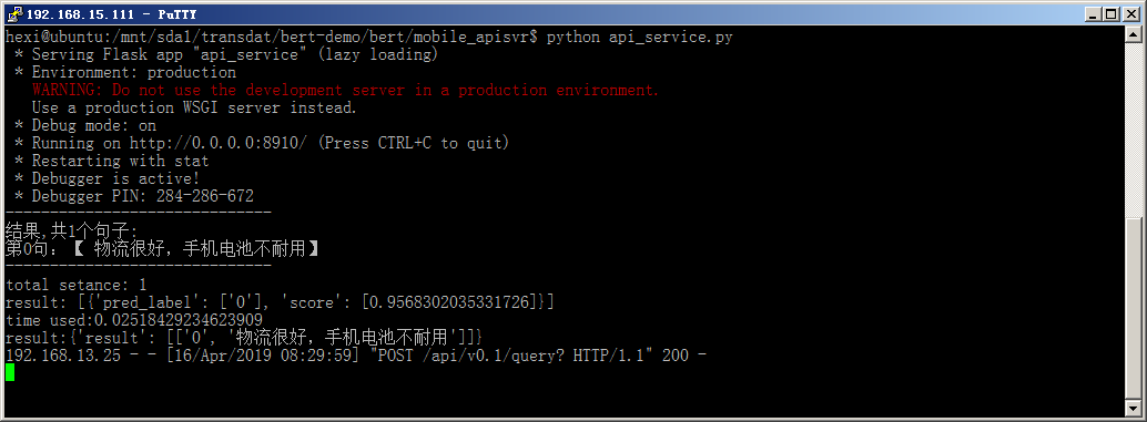 可以看到对应的两个评论,预测结果一个是1,另一个是-1,计算的速度还是非常很快的。通过这种方式来调用还是不太方便,知道了这个通讯方式,我们可以用flask编写一个API服务, 为所有的应用统一提供服务。