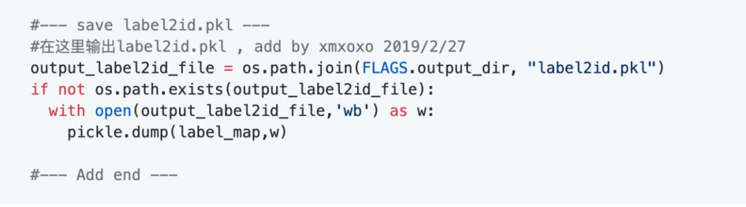特别说明,这里有一点要注意,在后期部署的时候,需要一个label2id的字典,所以要在训练的时候就保存起来,在convert_single_example这个方法里增加一段: