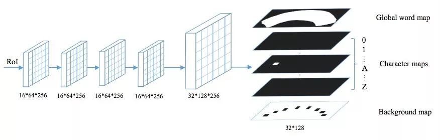 它将输入的RoI(固定大小16*64)经过4层卷积层和1层反卷积层,生成38通道的图(大小32*128),包括一个全局文本实例图——它给出了文本区域的精确定位,无论文本排列的形状如何它都能分割出来,还包括36个字符图(对应于字符0~9,A~Z),一个字符背景图(排除字符后的的所有背景区域),在后处理阶段字符背景图会被用到。