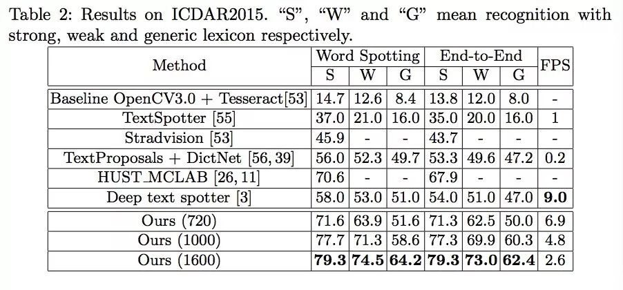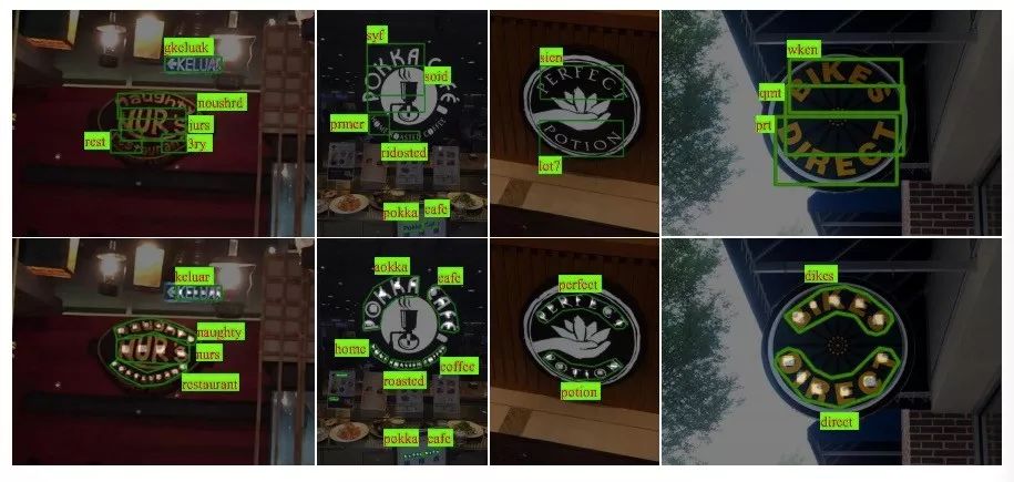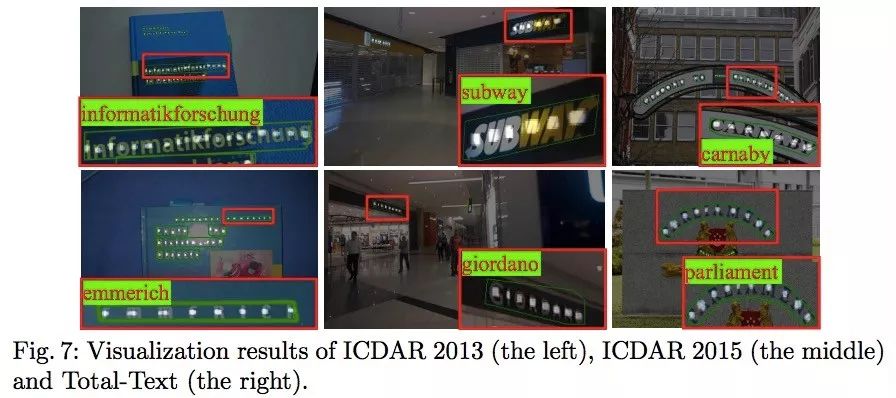 左图是水平text spotting方法的结果,它的检测框是水平的;中间图是具有方向的text spotting方法的结果,它的检测框倾斜;右图是该文提出的Mask TextSpotter算法的结果,它的检测框不是外接矩形而是一个最小外接多边形,对这种弯曲文本达到了更精确的文本检测和识别。