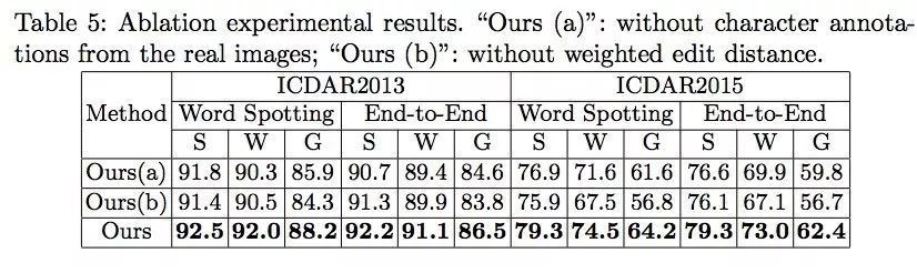 如果去除训练样本中的真实世界字符标注图像,模型依然可以达到相当竞争力的性能。下图中Ours(a)即不使用真实世界字符标注图像的训练结果。