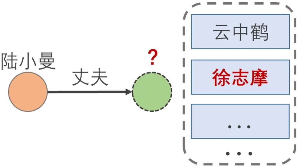 知识图谱补全 (Knowledge Graph Completion),是根据知识图谱中已有的三元组去对未知三元组进行预测。我们使用 表示已知头实体和关系来预测尾实体, 表示已知关系和尾实体来预测头实体,其中 和 被称为查询 (Query)。实际上,知识图谱补全任务,本质上给定查询下的排序问题。比如,对于图2所示的查询 (陆小曼,丈夫,?),返回的是预测答案的排序列表,正确答案排名越高,预测的效果就越好。