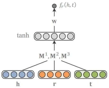 通过这种方式,实体在不同关系下可以有不同的表示,最后的打分函数定义为: