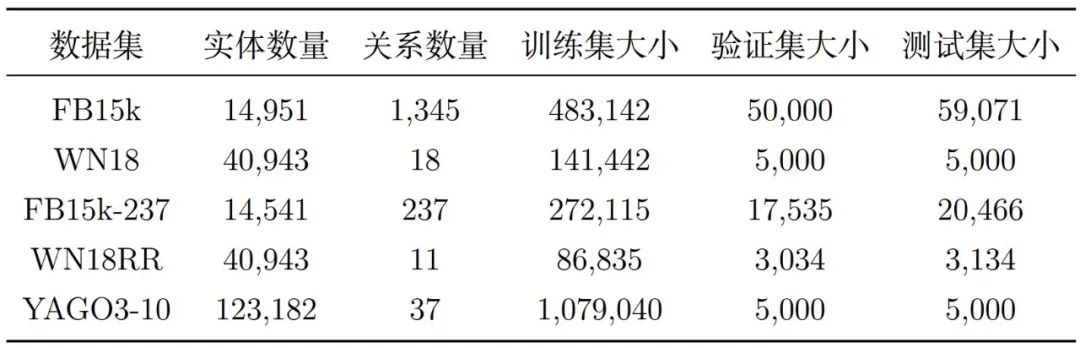 知识图谱补全任务上,目前常用的数据集有 WN18RR, FB15k-237 和 YAGO3-10 等,它们分别是 WN18,FB15k 和 YAGO3 的子集。WN18 和 FB15k 数据集早期被用于知识图谱补全任务,但是后来有研究者发现这两个数据集存在一定的测试集泄漏问题,在这两个数据集上,简单的基于规则的方法就能够达到先进模型的效果,所以 WN18 和 FB15k 渐渐不被研究者使用。表1显示了知识图谱补全数据集的具体统计信息,其中数据集大小指的是三元组的数量。