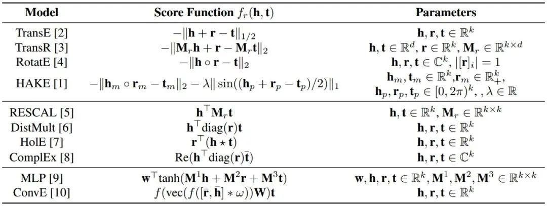 同时输入神经网络,来判断三元组的打分。早期的工作如 MLP [9] 使用全连接神经网络来对给定的三元组进行打分。近年来,ConvE [10] 等工作使用卷积神经网络 (Convolutional Neural Network) 来定义打分函数。由于知识图谱是一种图结构的数据,近期也有一些工作将图神经网络 (Graph Neural Network) 应用于知识图谱嵌入。