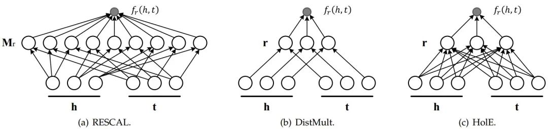 可以看作是 的双线性函数,其中矩阵 。为了降低计算量,DistMult [6] 将矩阵 设计成对角矩阵,HolE [7] 则使用循环相关运算 (Circular Correlation Operation) 来代替中间的关系矩阵乘积。这些方法计算方式的示意图见图5。
