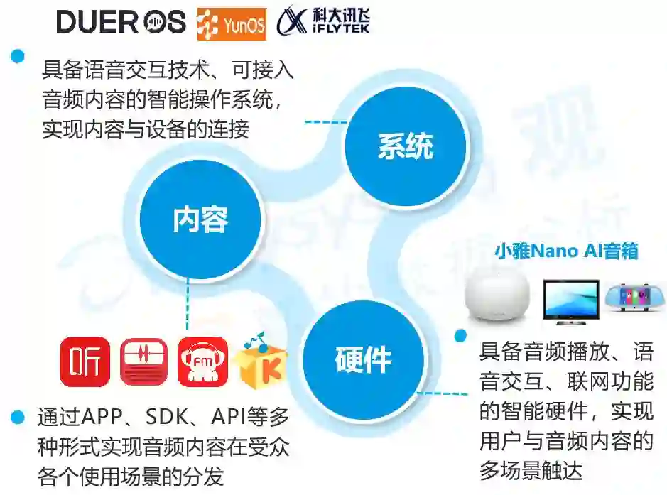 音频内容与收听场景的相互适应、语音交互与音频播放技术的发展,为音频智能硬件在各个场景下实现了用户与音频内容的触达赋能;车联网、智能家居等概念的兴起与实践,推动了车载音频、智能音箱等硬件的发展。喜马拉雅推出的全内容智能音箱小雅Nano,40个小时10万台暨告售罄,体现了智能硬件产品巨大的市场潜力。