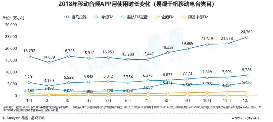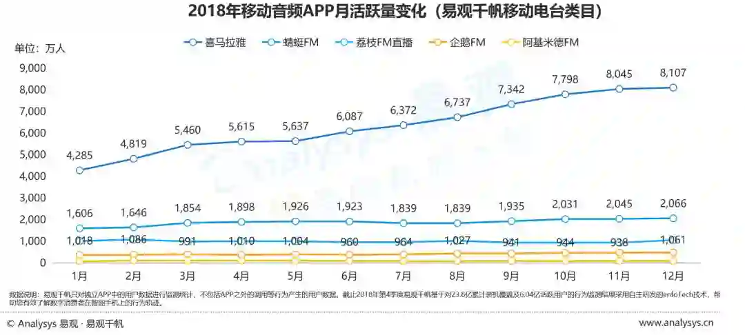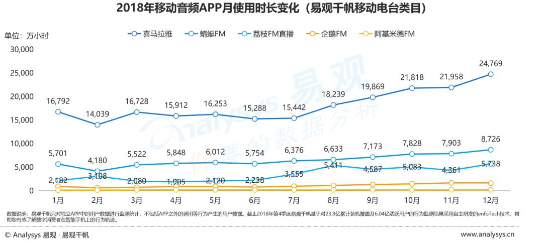 过去的一年,国内移动音频市场经历了高速发展。2018年用户规模连续12个月稳步增长,全年涨幅达到50.3%;在用户行为方面打开次数和使用时长下半年迅猛增长;而用户结构呈现出男性化、高龄化和精英化的显著特征。
