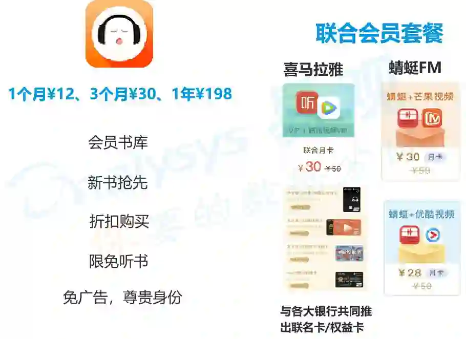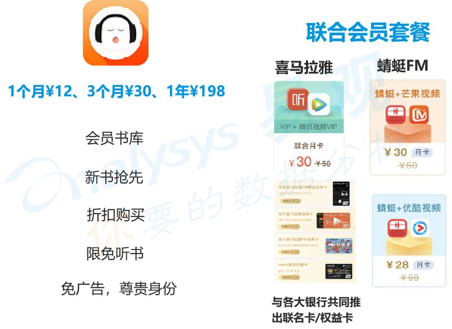 移动音频头部平台与网络视频平台发展联合会员,提高会员权益,实现流量互通,增加会员收入;喜马拉雅推出的免费听会员精品的小雅Nano音箱,将会员价值与硬件相结合,打造闭环式会员增值服务;蜻蜓FM与Wehotel推出联合会员,布局线下获客场景,给会员以全场景无缝衔接的节目收听体验。