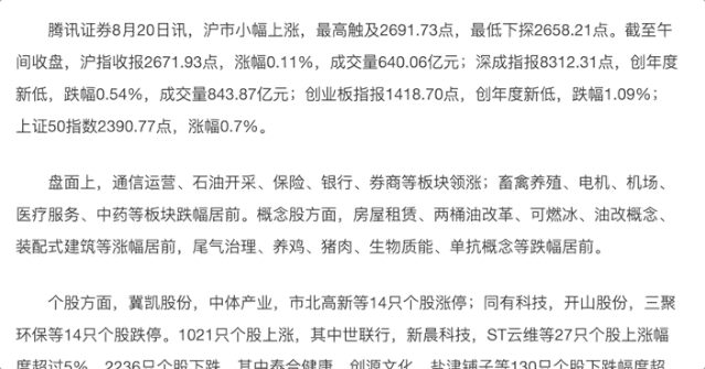 2018年8月20日11:32分,上午股市刚刚收盘2分钟,腾讯证券就发表了了一篇股评文章,名为午评:沪指小幅上涨0.11%报2671.93点 通信运营、石油开采等板块领涨,全文949字。